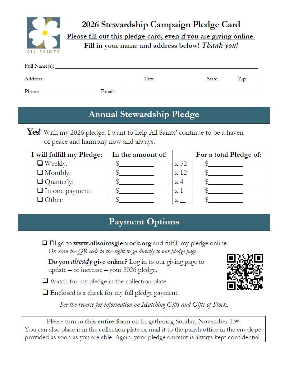 Through the ministry of our parish, God works with us and through us – inspiring us to deepen our faith and to reach out to those in need. If you haven’t done so already, take a moment to become a pledging member or to renew your pledge to All Saints’. Click on the images above to see our Stewardship Materials or find them on the Information Table in the rear of the Church. For your prayers, your participation, and your pledges of financial support, and for all that you do for All Saints’, thank you!